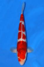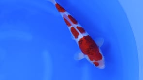 This Nisai Ai Goromo from Otsuka Koi Farm (Japan) features a bright, clean shiroji base accented by a well-balanced multi-step beni pattern that flows neatly from the head through the body, creating strong visual rhythm and balance. The beni shows developing Ai Goromo reticulation, with subtle blue-grey edging emerging within the red plates, adding depth and refinement without overpowering the pattern. The head carries an attractive, well-positioned marking that enhances character while maintaining clarity around the nose. The body is slender and streamlined with a smooth topline and even proportions, suggesting continued elegant development. Translucent pectoral fins and tidy kiwa contribute to a refined overall presentation, making this a classic, developing Ai Goromo with strong skin quality and promising future potential.