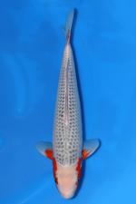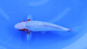 This Nisai Asagi from Otsuka Koi Farm (Japan) displays a clean, refined appearance with a soft blue-grey base and evenly developing reticulation running consistently along the back. The net pattern is neat and balanced, giving a classic traditional Asagi look. Bright, well-placed hi accents frame the cheeks and extend into the pectoral fins, adding strong contrast against the pale head and luminous skin. A subtle line of developing hi along the dorsal area and tail adds character while remaining elegant and understated. The body is long and streamlined with a smooth frame, good symmetry, and promising growth potential as it matures—an attractive, well-balanced Asagi with excellent skin quality and classic Otsuka refinement.