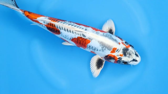 This koi offers super quality for the price. Marusaka is a farm we love to buy koi from, the metallic varieties available make it better for us to offer a fantastic selection. This koi has nice metallic beni (red) quality with super Snow White skin. Sumi (black is developing and as it develops this will have a killer pattern.