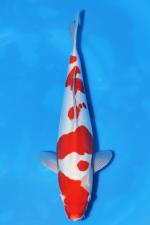 The bright shiroji provides a smooth, scaleless canvas that enhances the clarity of the vibrant hi plates. The red pattern begins with a bold head marking and steps evenly down the body, with well-defined edges and pleasing balance. The doitsu skin accentuates the sharpness of each color boundary, giving the koi a crisp, modern appearance.