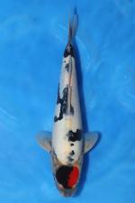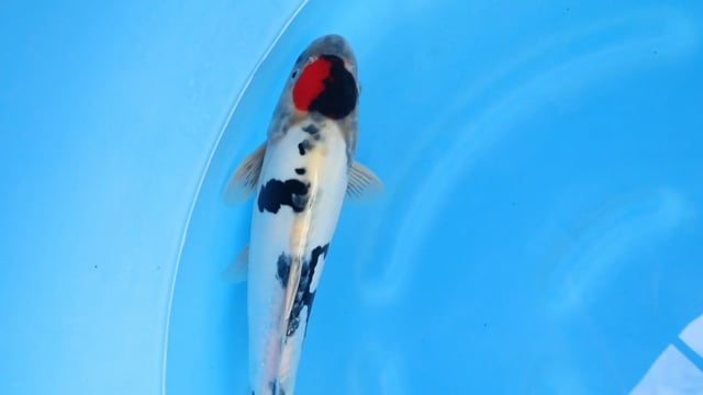 An exceptional high quality Doitsu Tancho Showa from Hiroi Koi Farm. This koi offers superb beni (red), black (sumi) and shiroji (white) quality with really nice Tancho (Ying Yang) style spot and great sumi placement. This koi is perfect for the UK water and will continue to develop well.