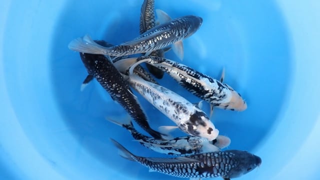 Takatatsu offers fantastic high quality Gin Rin Aragoke and these are exceptional. With different colours and styles these will grow into superb strong bodied koi with impressive scales. These are very similar to the Dainichi Black Zeus in style.