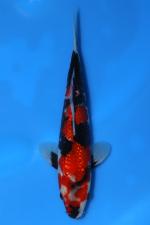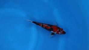This Tosai Gin Rin Showa from Ogata Koi Farm, Japan presents a strong young frame with excellent early balance and presence. The body is covered in bright, reflective gin rin scales that shimmer across a vibrant base of deep red beni, contrasted by developing blocks of rich sumi that add depth and movement to the pattern. Clean white shiroji highlights the separation between colors, while the head carries an engaging mix of beni and sumi that gives the koi personality. The even distribution of pattern from head through tail, combined with promising skin quality and emerging sumi, suggests excellent potential for this Tosai to mature into a bold and visually striking adult Showa.