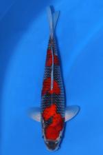 A striking nisai Goshiki from Otsuka Koi Farm, Japan, displaying a strong, balanced frame with impressive early colour development. The deep, lacquered grey to black reticulation forms an even net pattern across the body, creating bold contrast against the vibrant, thick beni plates that sit prominently along the dorsal line. The hi shows good depth and uniformity, with a rich, glowing tone that stands out strongly against the darker base.