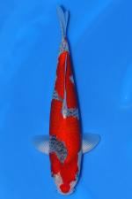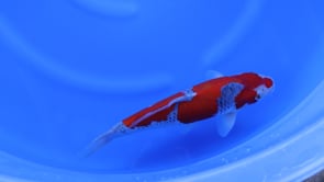 The head carries a distinctive, balanced red pattern with a clean nose marking that adds character and visual impact. Subtle kage-style shading enhances depth while still allowing the vivid red to remain the dominant feature. Pectoral fins appear clear and well-shaped, complementing the koi’s tidy frame and suggesting solid growth potential. As this Kanno-bred Goshiki continues to develop, the reticulation is expected to strengthen, giving greater definition and a more dramatic, high-contrast finish.