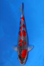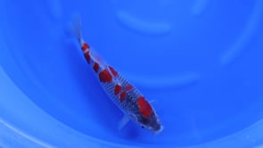 The underlying netting is already becoming visible through the scales, giving depth and texture while indicating continued development as the koi matures. The contrast between the luminous hi and the strengthening sumi-based background adds visual strength without overwhelming the pattern. Clear, tidy pectoral fins and a smooth frame complete the overall presentation, making this young Kanno-bred Goshiki a promising fish expected to gain richer color contrast and enhanced definition with age.