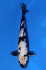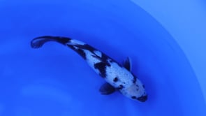 This Kage Shiro Utsuri nisai from Otsuka Koi Farm (Japan) presents a sleek, well-proportioned body with a strong, streamlined frame and balanced fin structure. The koi displays the classic Kage influence, with soft grey shadowing and subtle reticulation emerging through the shiroji, adding depth and character. Deep, inky sumi wraps along the dorsal line and tail section, contrasted by clean white areas that create a natural, flowing pattern. A distinctive head marking and lightly mottled mid-body give this fish individuality while maintaining overall harmony. With clear skin quality, developing contrast, and promising future refinement, this nisai shows excellent potential as it matures.