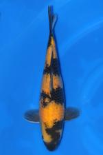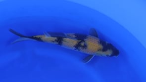 This Female Ki Utsuri nisai from Otsuka Koi Farm, Japan presents a streamlined body with a clean frame and healthy skin quality, giving it a refined and balanced appearance in the bowl. The rich Ki (yellow) base displays good warmth and consistency, overlaid with deep, inky sumi that forms bold, stepping bands across the shoulders and mid-body. The contrast between the developing yellow ground and the darker sumi creates a strong, eye-catching presence while still showing room for future transformation.