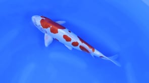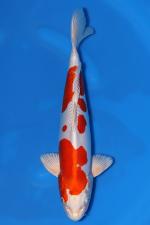 A beautiful Nisai Kikusui from Marusaka Koi Farm (Japan) displaying strong metallic hikari over a bright, clean shiroji base. The vibrant beni forms a bold, flowing pattern beginning with an eye-catching head plate and continuing in well-spaced steps along the doitsu body. The neatly aligned dorsal mirror scales add definition and symmetry, enhancing the koi’s elegant presentation. The body conformation is smooth and balanced with a solid frame and tidy tail section, suggesting continued growth potential. Finished with clear pectorals and an overall harmonious red-and-white balance, this koi offers excellent skin quality, visual impact, and promising future development.