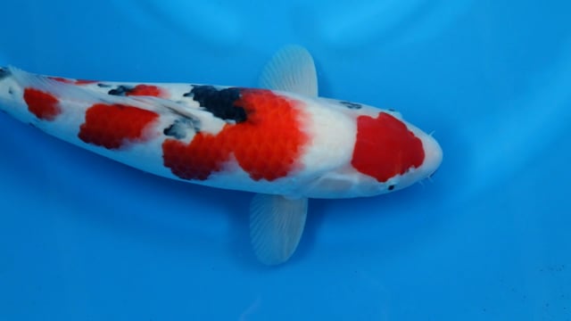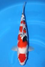The koi shows a solid nisai body with a smooth frame, balanced pectoral fins, and good skin quality. As it continues to mature, the sumi is expected to consolidate and deepen, refining the contrast and enhancing the traditional elegance of this Sanke pattern.