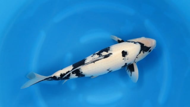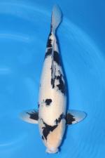 A superb example of a Shiro Utsuri with good sumi quality and shiroji. The pattern is well balanced and easy to understand the fish. This koi is from the DK lineage.