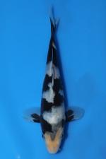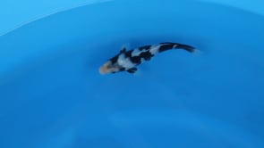 This Tosai Shiro Utsuri from Ogata Koi Farm (Japan) shows a strong, classic appearance with deep, inky sumi set against a bright, developing shiroji base. The head carries a soft, clean expression accented by emerging sumi that flows smoothly into a well-balanced body pattern, creating good visual movement from front to tail. The sumi plates appear thick with areas still rising, indicating promising future development and sharper contrast as the koi matures. Structurally, the koi presents a straight backbone, even taper, and solid tail tube that suggest good growth potential. Finished with balanced motoguro in the pectoral fins and an overall harmonious silhouette, this young Shiro Utsuri is an attractive and promising grow-on koi.