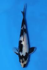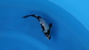 This Tosai Shiro Utsuri from Ogata Koi Farm (Japan) displays a clean, elegant look with strong, glossy sumi contrasted against a bright, developing shiroji base. The head features an eye-catching, character-filled pattern that leads into a nicely spaced body design, creating a pleasing sense of flow and balance along the frame. The sumi appears thick with areas still consolidating, suggesting continued development and sharper definition as the koi matures. The body shows a straight backbone, smooth taper, and solid tail tube that point toward good growth potential. Finished with balanced pectoral fins and an overall refined silhouette, this young Shiro Utsuri is a stylish and promising grow-on koi.