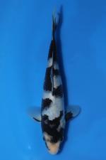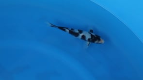 This Tosai Shiro Utsuri from Ogata Koi Farm (Japan) displays a strong, traditional black-and-white contrast with deep developing sumi set over a clean, bright shiroji foundation. A bold head pattern flows smoothly into balanced mid-body markings, creating an appealing rhythm that carries through to the tail section. The sumi appears layered with areas still rising, indicating future strengthening and refinement as the koi matures. The body line is straight with a slender, youthful frame and good tail tube, suggesting solid growth potential. Finished with balanced pectoral fins and a clean overall silhouette, this young Shiro Utsuri offers both visual impact now and promising future development.