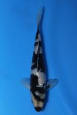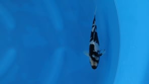 This Tosai Shiro Utsuri from Ogata Koi Farm (Japan) displays a bold, developing sumi pattern set over a clean, milky white base. The head features strong black markings that create an immediate focal point, flowing into well-placed body bands that provide rhythm and balance along the frame. The sumi appears soft and youthful with areas of underlying depth, indicating continued consolidation and refinement as the koi matures. A slender, even body line with a straight backbone and proportionate tail tube suggests healthy growth potential. Light motoguro accents in the pectoral fins and an overall dynamic contrast give this young Shiro Utsuri both present appeal and promising future development.