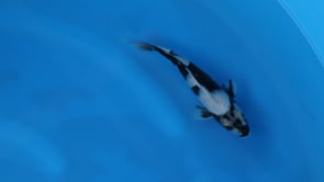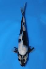 This Tosai Shiro Utsuri from Ogata Koi Farm (Japan) displays a strong young frame with a pleasing balance of deep lacquer-style sumi over a clean white base. The head features distinctive black markings that give character while maintaining overall harmony and expression. A bold dorsal sumi band runs through the body, contrasted by open white areas that create an appealing, flowing pattern with room for future development. The pectoral fins show well-defined motoguro, enhancing the classic Shiro Utsuri look and adding visual strength. With its straight body line, solid bone structure, and developing skin quality, this Tosai shows excellent promise as the sumi continues to refine and intensify with maturity.