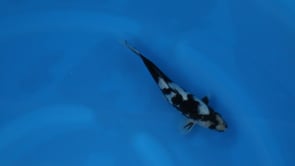 This Tosai Shiro Utsuri from Ogata Koi Farm (Japan) displays a slim, well-proportioned young body with a clean frame and smooth topline, indicating good growth potential. Deep, lacquer-black sumi forms a strong foundation along the back and shoulders, contrasted by bright patches of developing shiroji that create a bold, flowing pattern through the midsection. The head carries a balanced mix of black and white markings that give character without overwhelming the face. Pectoral fins show emerging motoguro, adding strength and classic Utsuri presence. With solid skin quality and sumi that appears to be consolidating, this young koi has appealing contrast and promising development ahead as it matures.