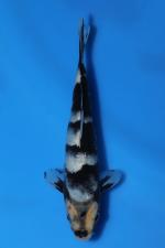 This Tosai Shiro Utsuri from Ogata Koi Farm, Japan shows a strong young frame with a clean, balanced body line and good overall symmetry. The sumi is deep and well-defined, forming bold bands across the body that create a striking, rhythmic pattern from shoulder to tail. Bright developing shiroji provides sharp contrast, giving the koi a dynamic black-and-white presence even at a young age. The head features distinctive sumi markings that add character without overwhelming the face, while the pectoral fins display emerging motoguro, enhancing its classic Utsuri look. With solid skin quality and sumi that appears to be consolidating nicely, this Tosai has promising future development and strong visual impact as it matures.