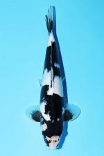 This Shiro Utsuri from Omosako Koi Farm displays a bold and classic black-and-white contrast typical of the breeder’s renowned bloodline.