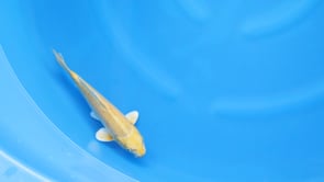 This Yamabuki Ogon tosai from Ogata Koi Farm showcases a brilliant, uniform metallic presence with excellent clarity.