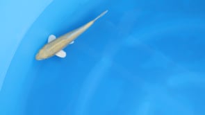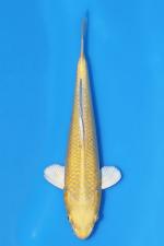 This Yamabuki Ogon tosai from Ogata Koi Farm exhibits a bright, uniform metallic brilliance with excellent scale definition.