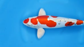 This koi offers super quality for the price. Marusaka is a farm we love to buy koi from, the metallic varieties available make it better for us to offer a fantastic selection. This koi has nice clean metallic beni (red) quality with super Snow White skin. Sumi (black is developing and as it develops this will have a killer pattern.